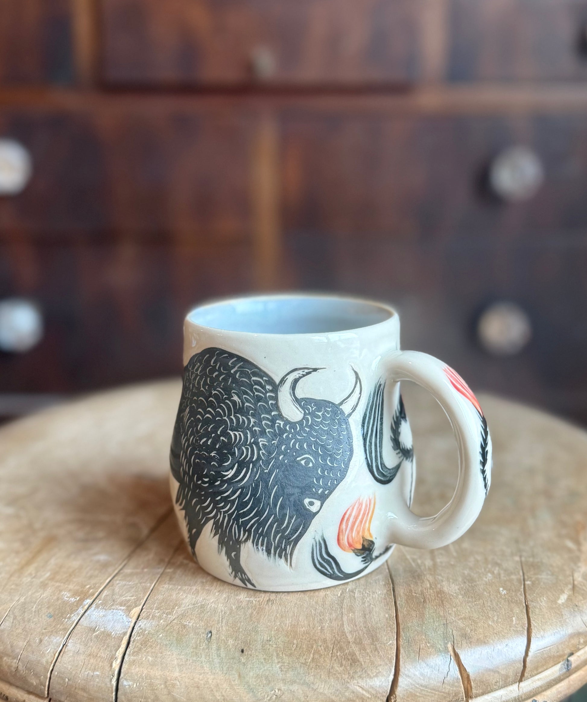 Large porcelain mug featuring my favorite Buffalo dancing with squash flowers